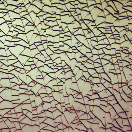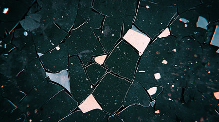 A dramatic macro view of a broken surface, creating a chaotic mosaic of dark speckled shards, sharp cracks, and scattered light-colored fragments.