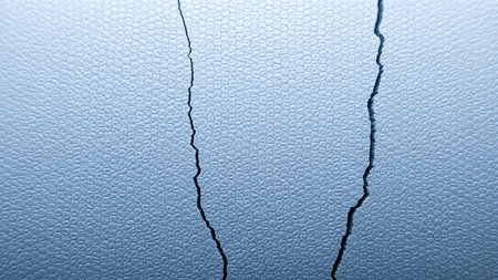 A close-up shot reveals a textured blue surface bisected by two jagged cracks. The surface has a subtle, organic pattern. The lighting is soft and even, highlighting the texture. The cracks add a sense of disruption.
