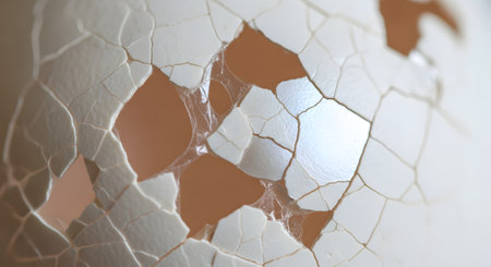 A delicate macro photograph of a shattered white eggshell, where the broken pieces are intricately held together by the translucent inner membrane. The abstract image showcases a beautiful fragility, representing concepts like birth, breakthrough, vulnerability, and new beginnings. The cracks and web-like structure create a fascinating and detailed texture.