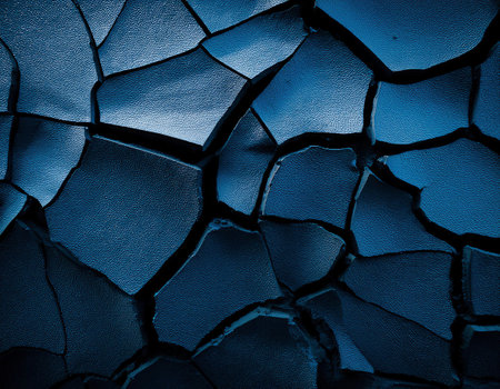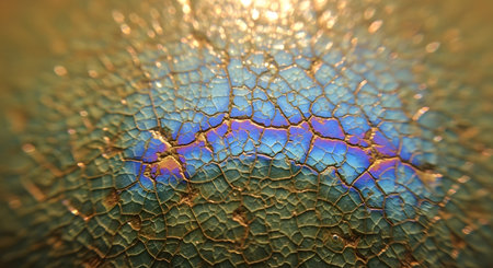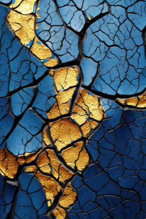 A mesmerizing macro shot of a cracked surface featuring intricate patterns of blue and gold hues. The texture resembles dried paint or ceramic glaze with an iridescent finish, creating a unique abstract background.