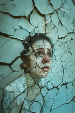 A woman's face is reflected in a broken window. The woman's face is distorted and her eyes are closed. Concept of sadness and despair