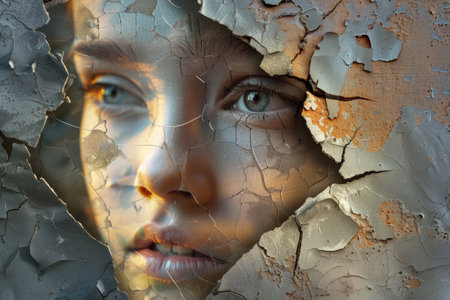A young woman is depicted with a serious expression, her image partially obscured by cracks in an old surface. The atmosphere conveys a sense of history and nostalgia.