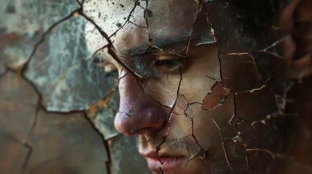 Close-up of a mans face seen through broken glass, symbolizing emotional distress