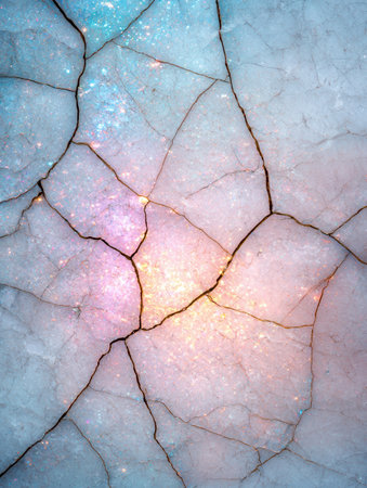 Abstract texture of cracked glass reveals intricate patterns highlighted by reflections of warm light, creating a captivating visual effect with depth and detail.