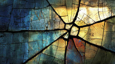 Grunge style abstract art of cracked stained glass window in multicolored hues. Concept of broken beauty, horror atmosphere, Halloween decor, scary abstract background, shattered texture, bg.