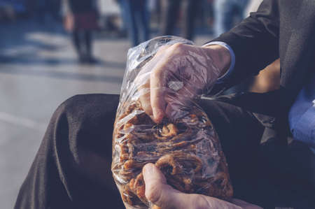 Man in suit is holding package of freshly caught and then boiled shrimps
