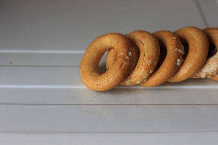 Drying or mini round bagels on a white wooden background. Copy, empty space for text.