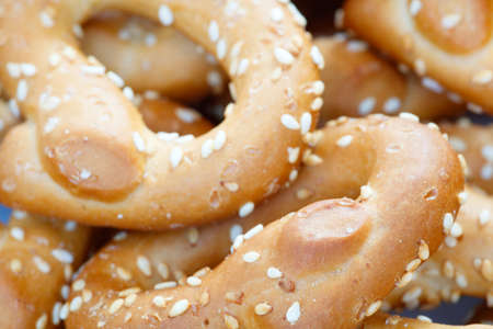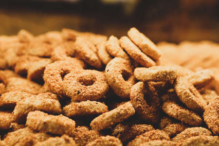 Close up photo of fresh yellow bagels. A popular type of flour products. One of the traditional treats for tea