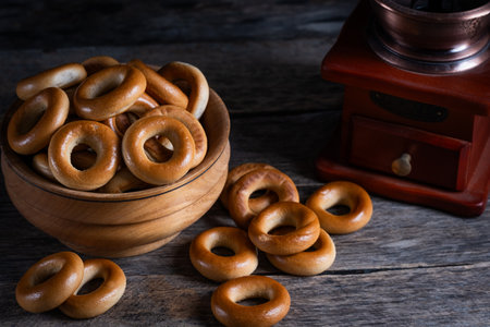 Bagels in wooden bowl and old coffee grinder on wooden background