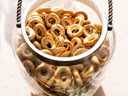 many Sushki with poppy seeds (traditional Eastern European crunchy bread rings) in vintage glass jar