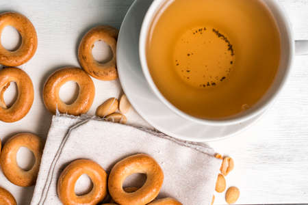 Sushki and tea cup on wooden background. Flat lay, top view. Russian national traditions
