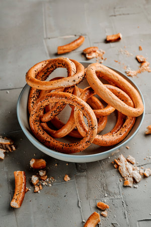 ceramic plate with some romanian bread rings, known as covrigi, sprinkled with poppy seeds, on a gray rustic concrete surface