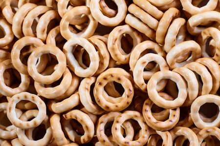 Tasty golden bagels. Mini round bagels texture, background. Top view.