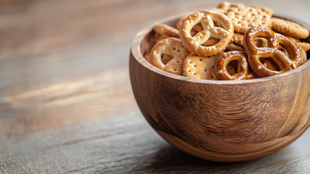 Crispy German snacks: saltine crackers and pretzels in a wooden bowl on a rough wooden surface. White background, copy space