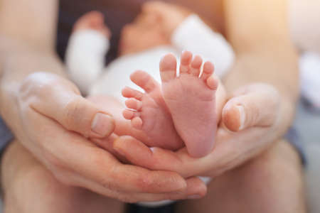 Father holding Baby Feet in Hands. Legs Newborn in male parents Hand. Small childrens Feet in the Fathers Palm. Close-up. Little Toes of Child and Man Hands of Happy Parent. Fathers Day Holiday