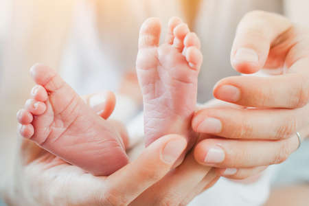 Close-up shot of cute small baby feet in loving mother hands, concept of happy family and motherhood