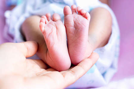 A mother's hand holds the baby's legs. Close-up. The end of Mother's Day and Parenthood.