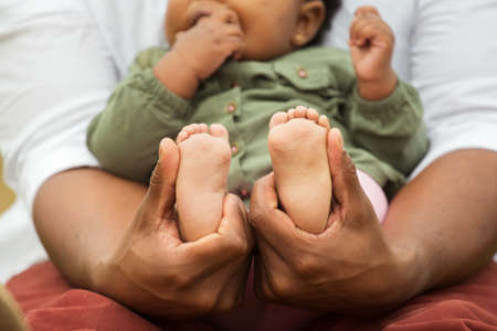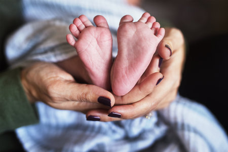 Tiny little feet. Closeup of a unrecognizable woman holding her little infant childs tiny feet in her hands at home during the day.