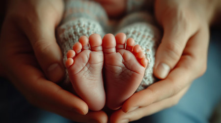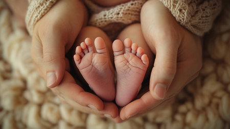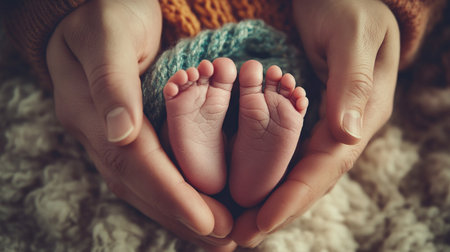 Extreme close-up of soft bare feet of a newborn baby wrapped in the mother's hands (cupped hands). Mom and her child, happy family and maternity concept. Generative Ai.