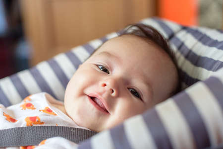 Cute little newborn girl with smiling face looking at camera on white background. Infant baby resting playing lying down on feeding chair at home. Motherhood happy child concept.