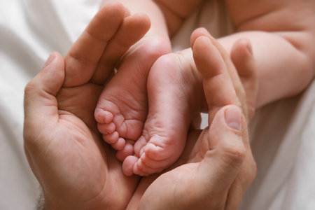Father holds newborn baby's feets. Tiny legs in woman's hand.