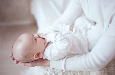 Cute baby 1 year old ying on mother hands in room closeup. Motherhood. Maternity. Childhood.