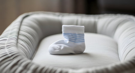 A single tiny, white baby sock with blue stripes rests in the middle of a soft baby lounger, creating a simple yet powerful image. The scene symbolizes pregnancy, the quiet anticipation of a newborn's arrival, and the love of new parents.
