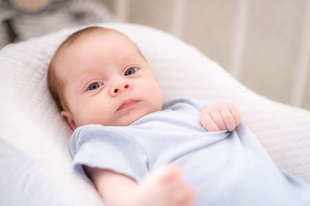 Portrait newborn baby boy lying in nursery cocoon with blue clothes on bed in bedroom at home, happy baby morning