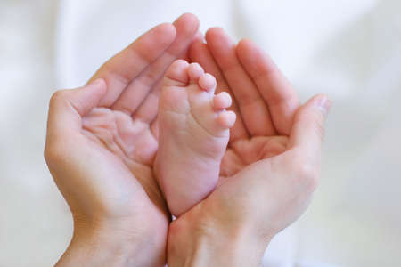 mother holds in her hands the feet of a newborn baby . new life concept . adopt me please . selective focus .