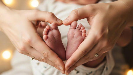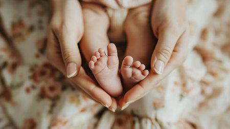Adult hands gently holding baby feet on floral background, symbolizing care and love. Generative AI