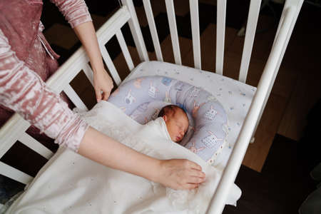 Mom straighten the blanket at the sleeping in the crib of the newborn.