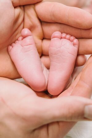 Feet of a newborn baby in the hands of parents. Happy family moment and concept.