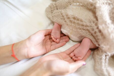 Little feet of newborn baby in mothers arms, covered warm beige knitted blanket which on white bed in bedroom.
