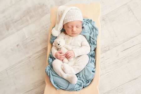 Cute newborn little boy sleeping in a white crib with toys. Baby goods packaging template. Closeup portrait of newborn baby with smile on face. Healthy and medical concept.