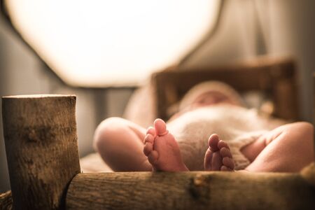 Close-up feet of a nursing baby who has recently been born. Newborn infant boy at home. Window light.