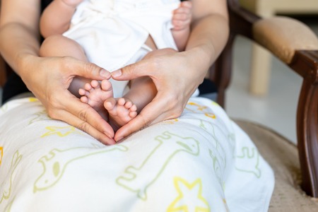 Newborn babys feet on Mothers hand in heart shaped, Family and Love concept.