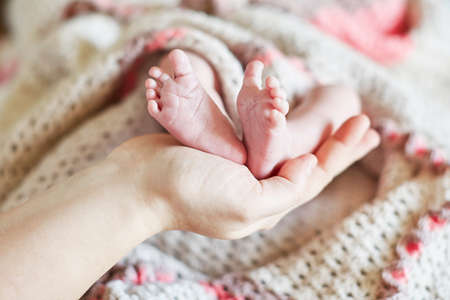 Close up of newborn baby feet. Baby's feet in the mother hands. Baby. Cozy. Family.