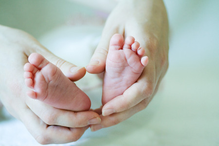 Mother holding newborn baby feet in hands. Mom taking care about infant child after taking bath. Parents childcare