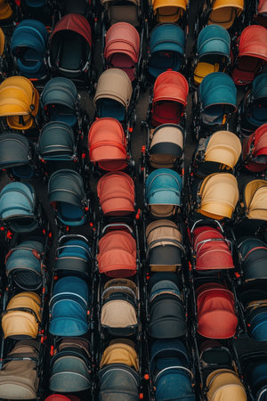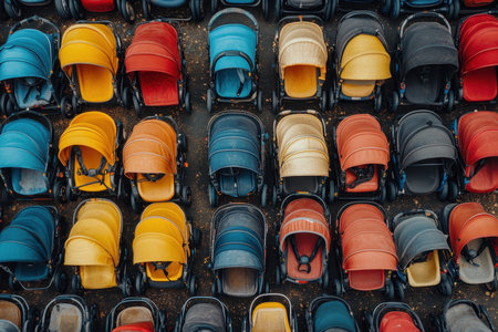 A vibrant collection of baby strollers in various colors is arranged neatly in a grid pattern. The scene captures the lively atmosphere of a busy urban park, showcasing the diverse styles and hues enjoyed by families.
