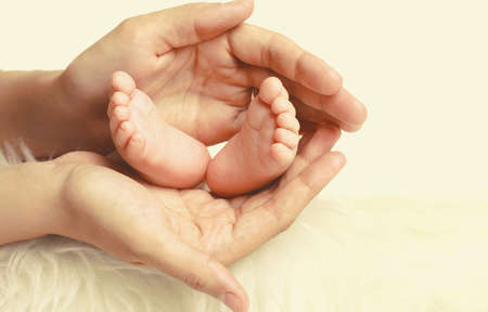 Newborn Babys feet. Mother and father holding newborn baby legs,legs massage concept of childhood, health care, IVF, hygiene