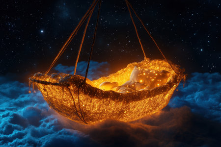 A cradle emits a warm glow, surrounded by twinkling stars in a dark, enchanting night sky environment.