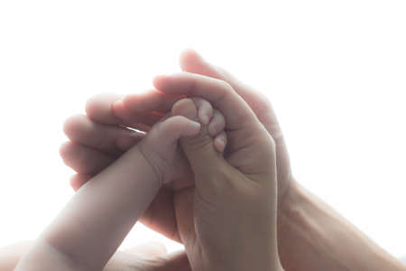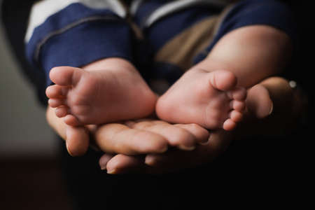 Leg of a newborn baby in the hands of parents. Mom and dad show care for their child. The concept of protecting a defenseless baby. Beautiful adult hands of a man and a woman and children little legs