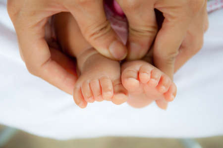 Upper view photo of a newborn girl embraced by her mother showing at camera her small feet