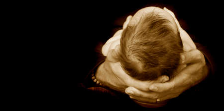 Mother holding baby head, there is concept or idea of love, family and happiness at the home, like mother caring for newborn. Monochromatic color