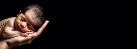 Extreme close-up of a newborn baby sleeping in the mother's hands isolated on a black background with copy space. Mom and her child, happy family and maternity concept. Wide banner. Generative Ai.
