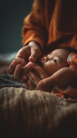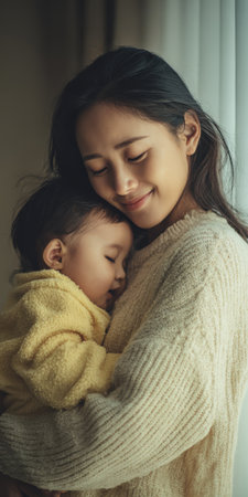 Asian mother holding her sleeping infant in a warm, loving embrace, depicting a quiet moment of maternal bonding and tender affection, representing family and motherhood
