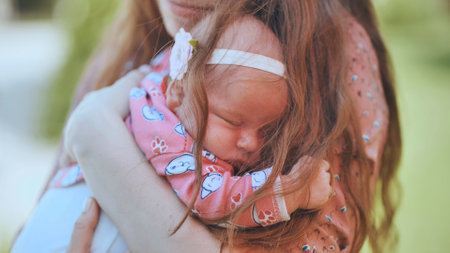 Mother tenderly embraces her sleeping newborn baby girl, creating a heartwarming moment of love and connection on a family day out