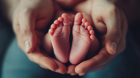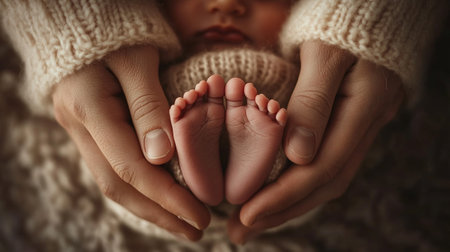 Close-up of baby feet cradled in adult hands against a soft focused background, conveying the concept of care and love. Generative AI