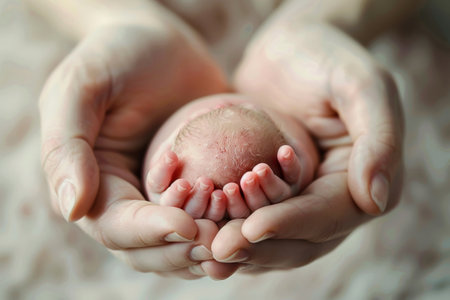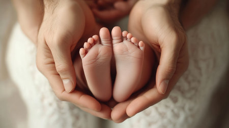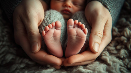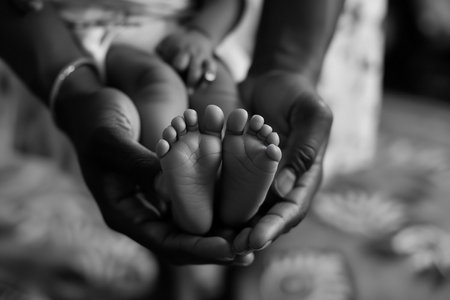 A monochrome close-up showcases a parents hands cradling a babys tiny feet. The image evokes tenderness and protection, symbolizing the start of life and the family bond.