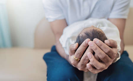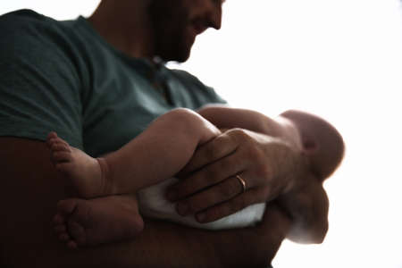 A father holding his baby son on his chest. Family bonding. Fatherhood